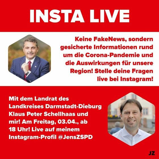 Aktuell sind viele FakeNews im Umlauf! Dem möchte ich entgegenwirken. Unter anderem mache ich deshalb am Freitag ein Insta-Live mit dem Landrat des Landkreises Darmstadt-Dieburg Klaus Peter Schellhaas. Wir klären dort live über den aktuellen Stand der Dinge auf. Außerdem könnt ihr uns natürlich auch direkt Fragen stellen! Bitte teilt diesen Beitrag, damit mehr Menschen die Möglichkeit auf gesicherte Informationen haben. Gemeinsam gegen den Virus und gegen FakeNews!