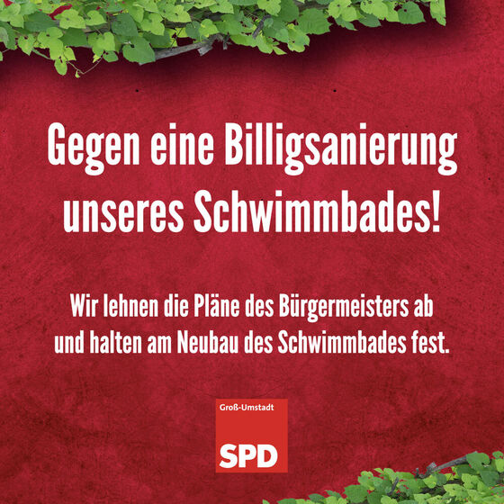 Vergangene Woche präsentierte der neue Bürgermeister René Kirch (CDU) überraschend seine neuen Pläne für das Groß-Umstädter Schwimmbad und wendet sich damit gegen die beschlossene Planung der Stadtverordnetenversammlung, die durch einen langjährigen öffentlichen Prozess entstanden ist. Anstelle eines neuen inklusiven und nachhaltigen Schwimmbads für alle Bürgerinnen und Bürger Groß-Umstadts, das auch wirklich den sozialen, ökologischen und kulturellen Anforderungen unserer Zeit standhält, soll hier zum wiederholten Male eine Machbarkeitsstudie für bis zu 100.000 Euro in Auftrag gegeben werden, um eine „Minimalsanierung im Bestand“ zu prüfen. Beispielsweise soll lediglich eine Folie in das alte Becken gelegt und auf ein neues solides Edelstahlbecken verzichtet werden, um die Baukosten zu minimieren. Gleichzeitig bedeutet dies aber einen höheren Reinigungsaufwand, was wiederum die Betriebskosten erhöhen würde. Und genau diese gilt es doch so gering, wie möglich zu halten, um die Wirtschaftlichkeit des Schwimmbads zu gewährleisten.