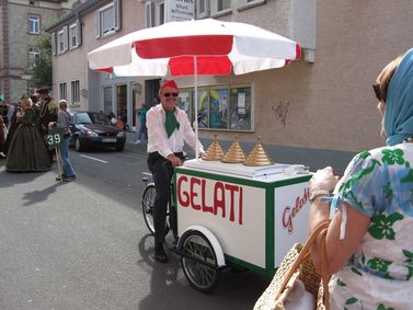 Beim diesjährigen Winzerfestumzug war auch die SPD Groß-Umstadt mit von der Partie. Unter dem Motto Gelati hatte man sich von der frisch unterzeichneten Verschwisterung mit Dicomano inspirieren lassen. Großer Beliebtheit, vor allem bei den kleinen Besuchern des Umzugs, erfreute sich die Eistruhe auf Rädern, die Horst Schneberger durch die umstädter Gassen steuerte.